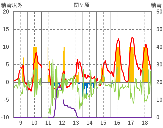 | 日 | 時 | 気温 | 降水 | 風向/風速 | 日照 | 積雪 | 降雪 |