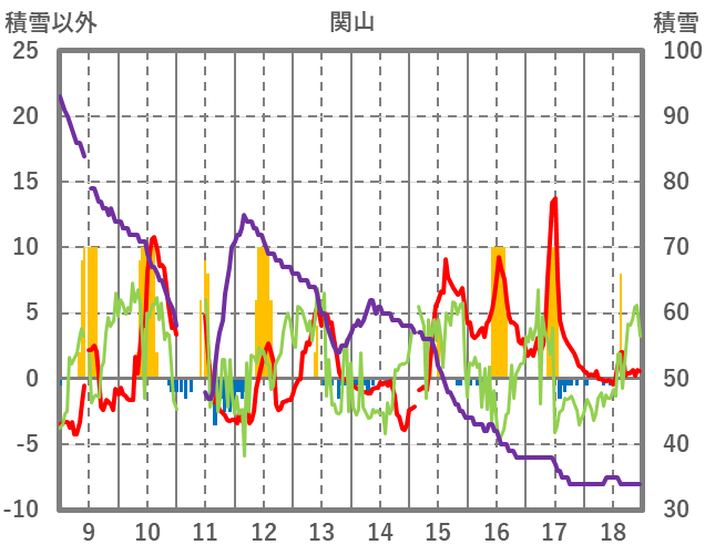 | 日 | 時 | 気温 | 降水 | 風向/風速 | 日照 | 積雪 | 降雪 |