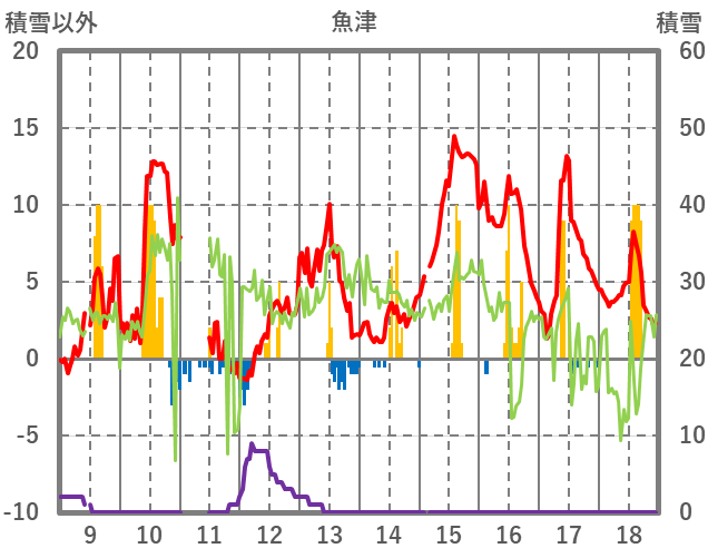 | 日 | 時 | 気温 | 降水 | 風向/風速 | 日照 | 積雪 | 降雪 |