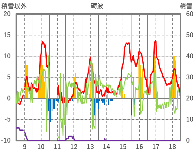 | 日 | 時 | 気温 | 降水 | 風向/風速 | 日照 | 積雪 | 降雪 |