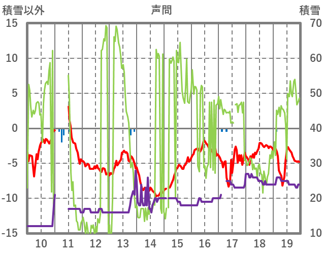 | 日 | 時 | 気温 | 降水 | 風向/風速 | 日照 | 積雪 | 降雪 |