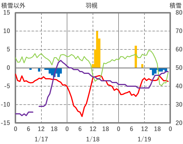 | 日 | 時 | 気温 | 降水 | 風向/風速 | 日照 | 積雪 | 降雪 |