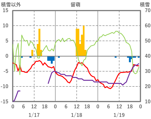 | 日 | 時 | 気温 | 降水 | 風向/風速 | 日照 | 積雪 | 降雪 |