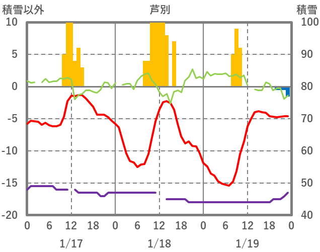 | 日 | 時 | 気温 | 降水 | 風向/風速 | 日照 | 積雪 | 降雪 |