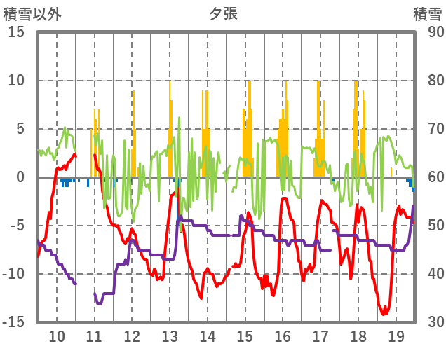 | 日 | 時 | 気温 | 降水 | 風向/風速 | 日照 | 積雪 | 降雪 |