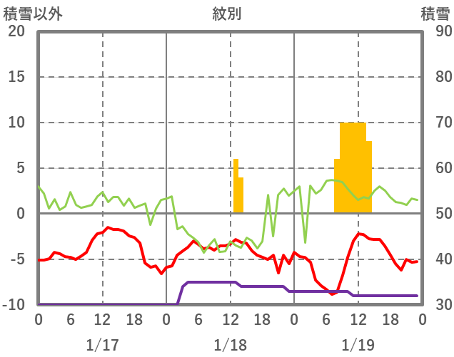 | 日 | 時 | 気温 | 降水 | 風向/風速 | 日照 | 積雪 | 降雪 |