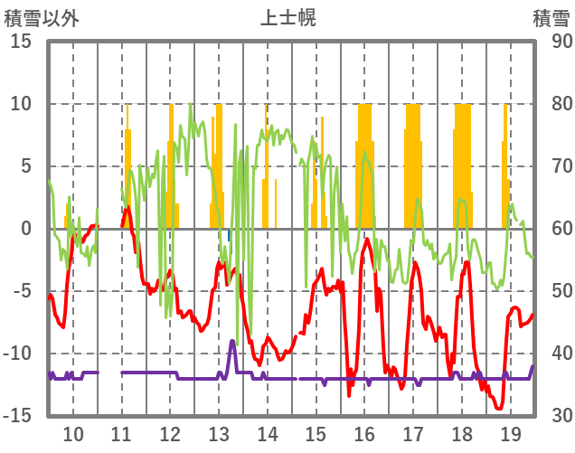 | 日 | 時 | 気温 | 降水 | 風向/風速 | 日照 | 積雪 | 降雪 |