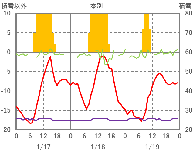 | 日 | 時 | 気温 | 降水 | 風向/風速 | 日照 | 積雪 | 降雪 |