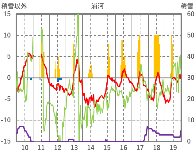 | 日 | 時 | 気温 | 降水 | 風向/風速 | 日照 | 積雪 | 降雪 |
