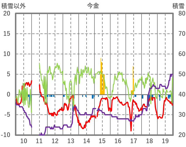 | 日 | 時 | 気温 | 降水 | 風向/風速 | 日照 | 積雪 | 降雪 |