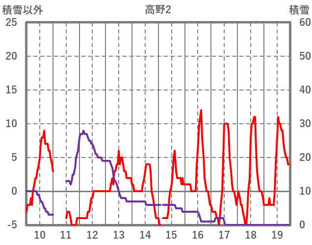 | 日 | 時 | 気温 | 降水 | 風向/風速 | 日照 | 積雪 | 降雪 |