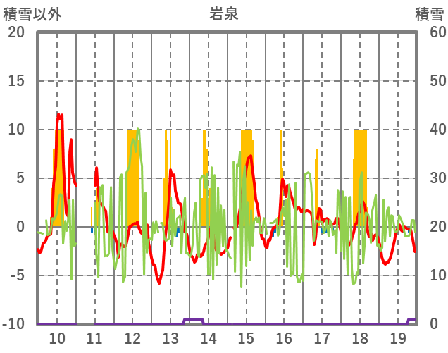| 日 | 時 | 気温 | 降水 | 風向/風速 | 日照 | 積雪 | 降雪 |