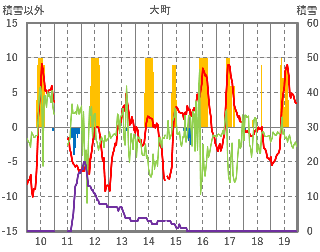 | 日 | 時 | 気温 | 降水 | 風向/風速 | 日照 | 積雪 | 降雪 |