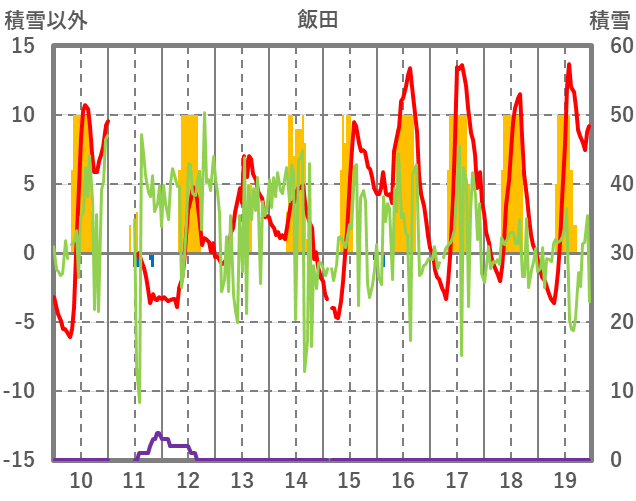| 日 | 時 | 気温 | 降水 | 風向/風速 | 日照 | 積雪 | 降雪 |