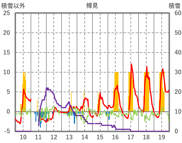 | 日 | 時 | 気温 | 降水 | 風向/風速 | 日照 | 積雪 | 降雪 |