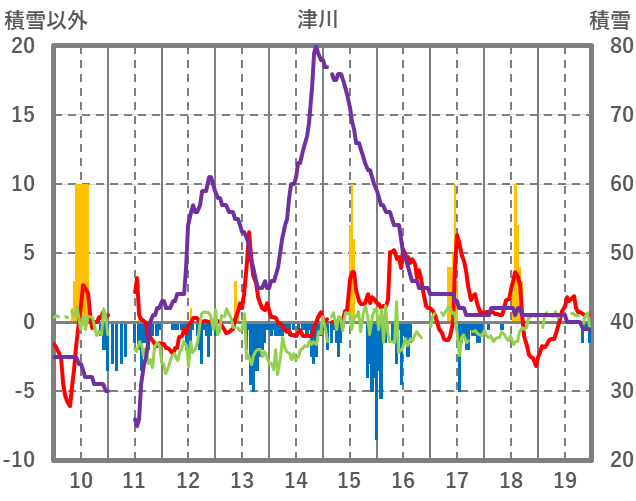 | 日 | 時 | 気温 | 降水 | 風向/風速 | 日照 | 積雪 | 降雪 |