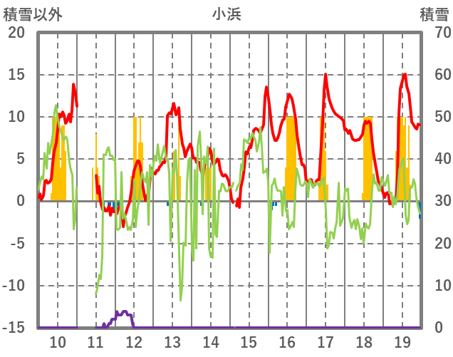 | 日 | 時 | 気温 | 降水 | 風向/風速 | 日照 | 積雪 | 降雪 |