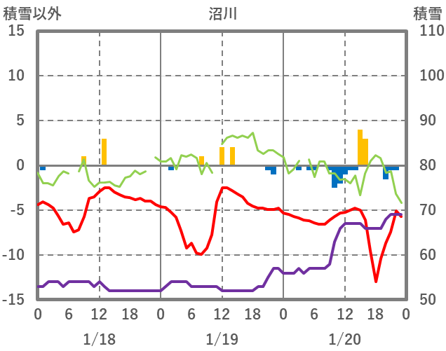 | 日 | 時 | 気温 | 降水 | 風向/風速 | 日照 | 積雪 | 降雪 |