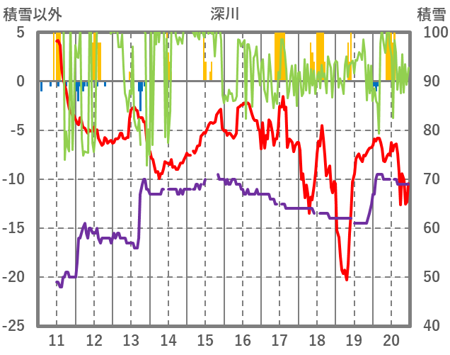 | 日 | 時 | 気温 | 降水 | 風向/風速 | 日照 | 積雪 | 降雪 |