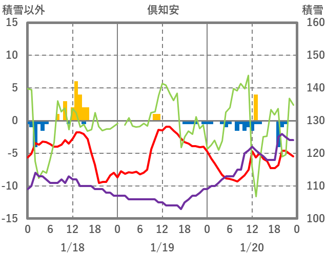 | 日 | 時 | 気温 | 降水 | 風向/風速 | 日照 | 積雪 | 降雪 |