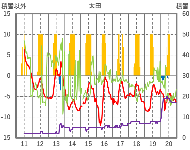 | 日 | 時 | 気温 | 降水 | 風向/風速 | 日照 | 積雪 | 降雪 |