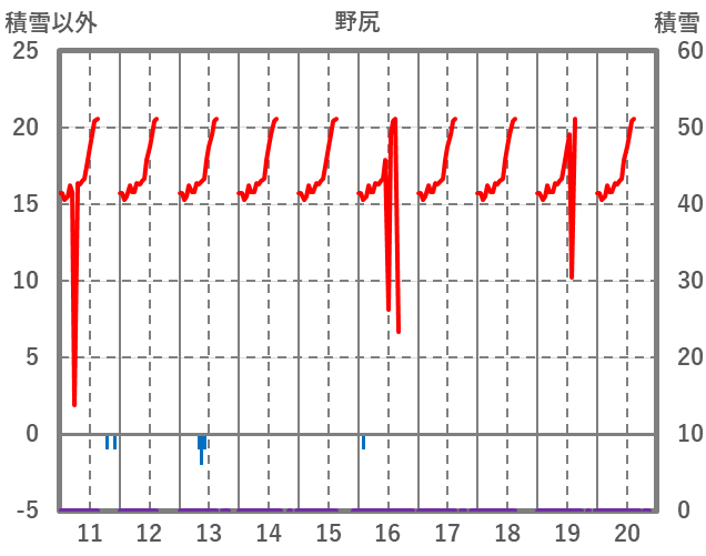 | 日 | 時 | 気温 | 降水 | 風向/風速 | 日照 | 積雪 | 降雪 |