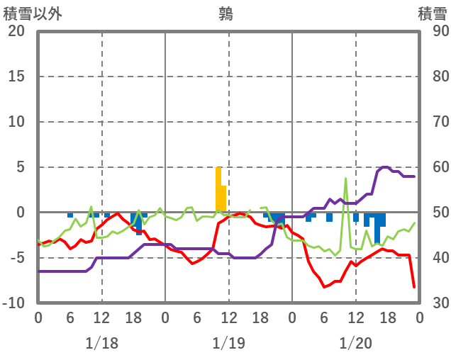 | 日 | 時 | 気温 | 降水 | 風向/風速 | 日照 | 積雪 | 降雪 |