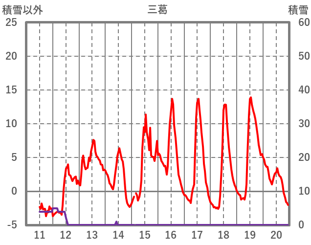 | 日 | 時 | 気温 | 降水 | 風向/風速 | 日照 | 積雪 | 降雪 |