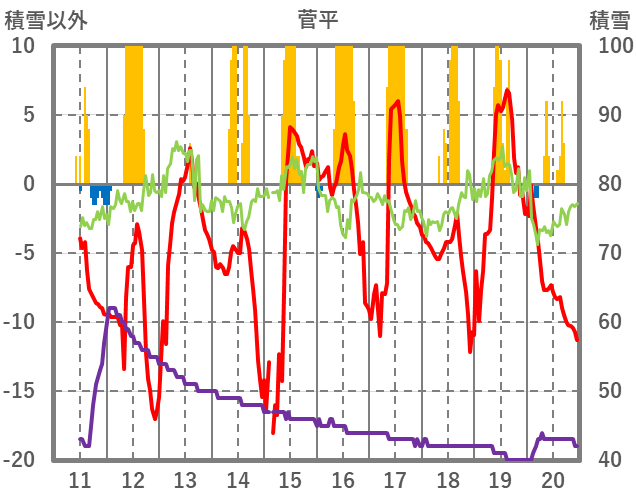 | 日 | 時 | 気温 | 降水 | 風向/風速 | 日照 | 積雪 | 降雪 |
