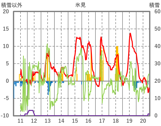 | 日 | 時 | 気温 | 降水 | 風向/風速 | 日照 | 積雪 | 降雪 |