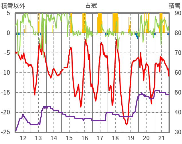 | 日 | 時 | 気温 | 降水 | 風向/風速 | 日照 | 積雪 | 降雪 |