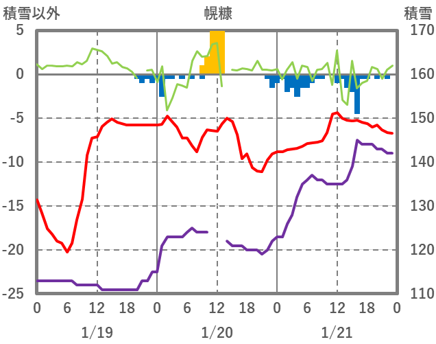 | 日 | 時 | 気温 | 降水 | 風向/風速 | 日照 | 積雪 | 降雪 |