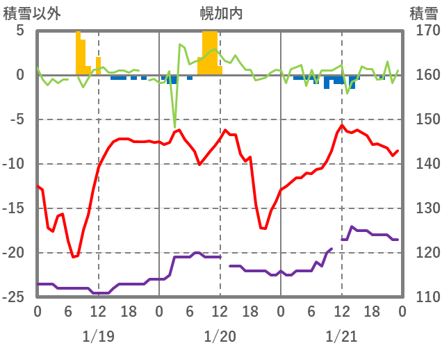 | 日 | 時 | 気温 | 降水 | 風向/風速 | 日照 | 積雪 | 降雪 |