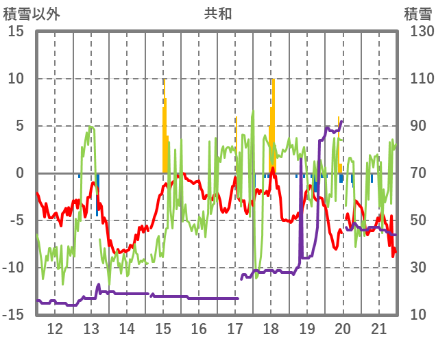 | 日 | 時 | 気温 | 降水 | 風向/風速 | 日照 | 積雪 | 降雪 |