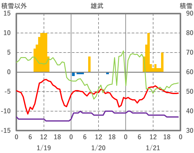 | 日 | 時 | 気温 | 降水 | 風向/風速 | 日照 | 積雪 | 降雪 |