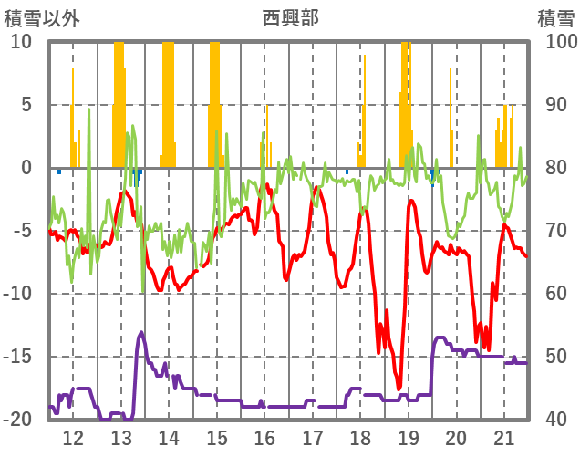 | 日 | 時 | 気温 | 降水 | 風向/風速 | 日照 | 積雪 | 降雪 |