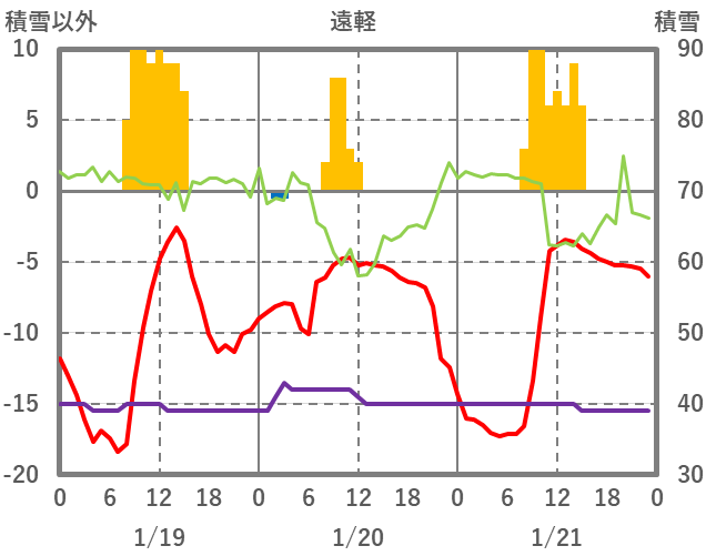 | 日 | 時 | 気温 | 降水 | 風向/風速 | 日照 | 積雪 | 降雪 |