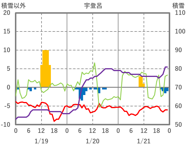 | 日 | 時 | 気温 | 降水 | 風向/風速 | 日照 | 積雪 | 降雪 |