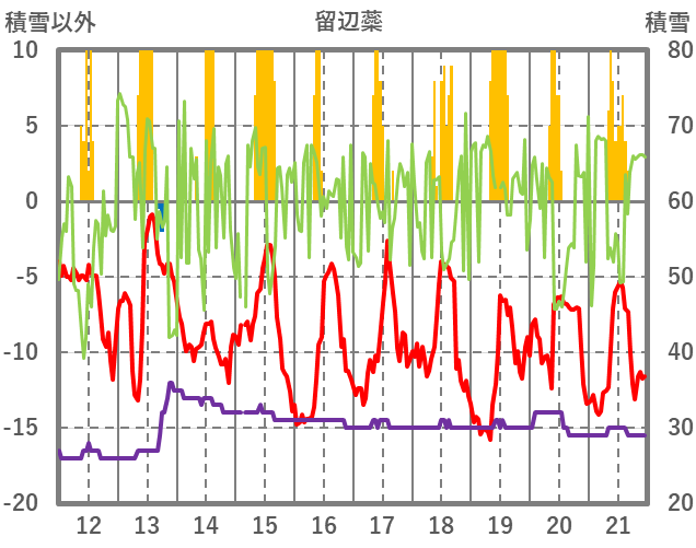 | 日 | 時 | 気温 | 降水 | 風向/風速 | 日照 | 積雪 | 降雪 |