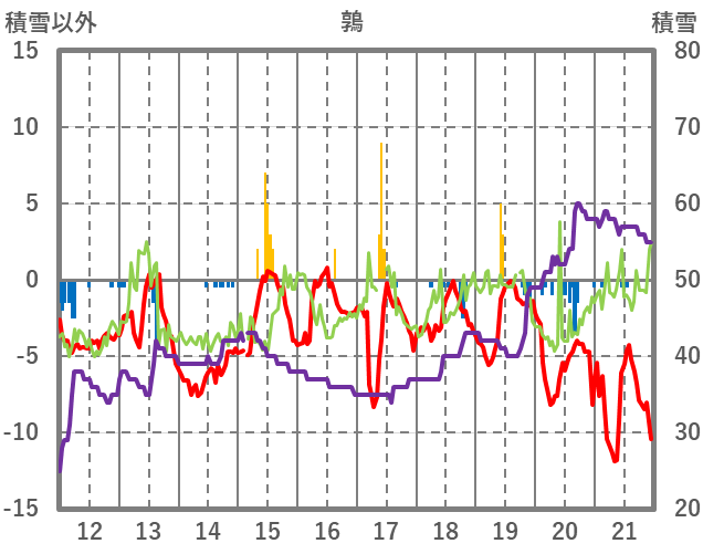 | 日 | 時 | 気温 | 降水 | 風向/風速 | 日照 | 積雪 | 降雪 |