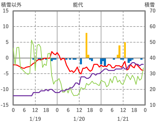 | 日 | 時 | 気温 | 降水 | 風向/風速 | 日照 | 積雪 | 降雪 |
