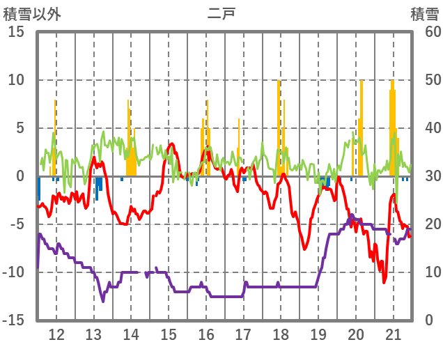 | 日 | 時 | 気温 | 降水 | 風向/風速 | 日照 | 積雪 | 降雪 |