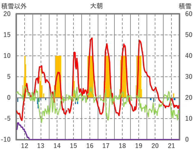 | 日 | 時 | 気温 | 降水 | 風向/風速 | 日照 | 積雪 | 降雪 |