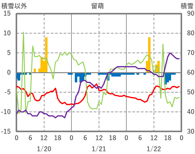 | 日 | 時 | 気温 | 降水 | 風向/風速 | 日照 | 積雪 | 降雪 |