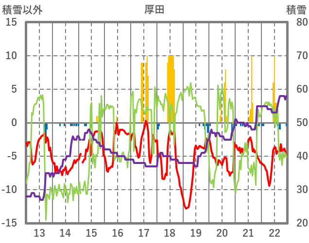 | 日 | 時 | 気温 | 降水 | 風向/風速 | 日照 | 積雪 | 降雪 |
