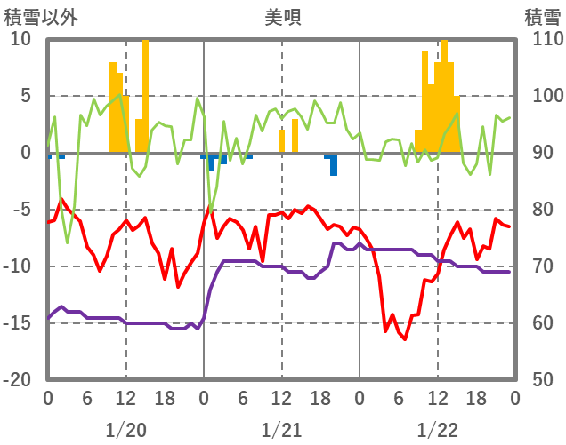 | 日 | 時 | 気温 | 降水 | 風向/風速 | 日照 | 積雪 | 降雪 |