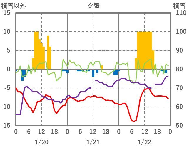 | 日 | 時 | 気温 | 降水 | 風向/風速 | 日照 | 積雪 | 降雪 |