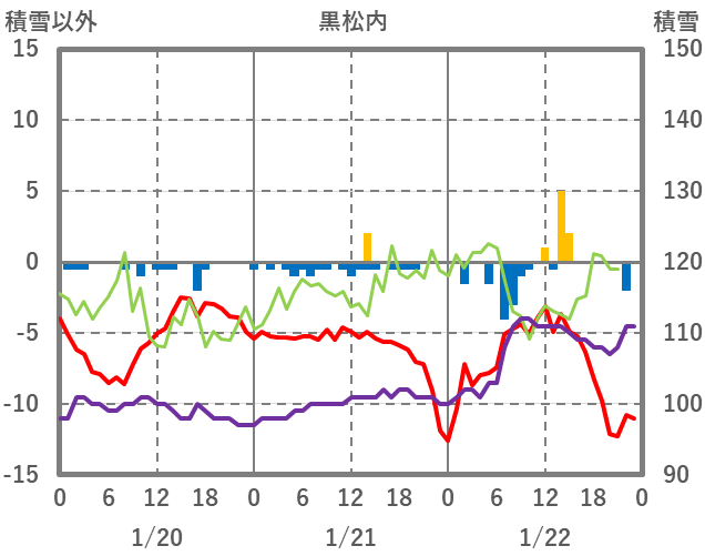 | 日 | 時 | 気温 | 降水 | 風向/風速 | 日照 | 積雪 | 降雪 |