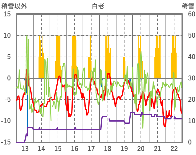 | 日 | 時 | 気温 | 降水 | 風向/風速 | 日照 | 積雪 | 降雪 |