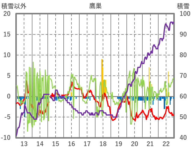 | 日 | 時 | 気温 | 降水 | 風向/風速 | 日照 | 積雪 | 降雪 |